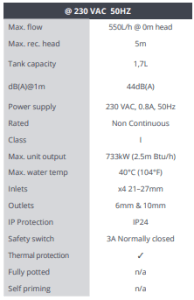 The best in class Max Hi-Flow tank pump carries on the Aspen Pumps tradition of build quality & high performance. With the lowest dB(A) rating & best IP rating (IP24 splash proof) of any tank pump, the Max Hi-Flow is the quietest & safest pump in its class.